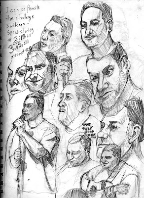 I was curious how far I could get by limiting myself to no more then 5 minutes per figure. In order to sketch them out quickly, I could only rough in the most basic of gestures before refining. On most of them, I started with the nose to get the tilt and angle of the head, moved to the left eye, then the right, put in the hair and the mouth, and then shaped out the rest of the head structure. Once that was in place I loosely drew out the body, building the clothes on top. For the most part I didn't get to the hands, and when I did, I didn't have nearly enough time to spend on them.